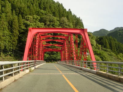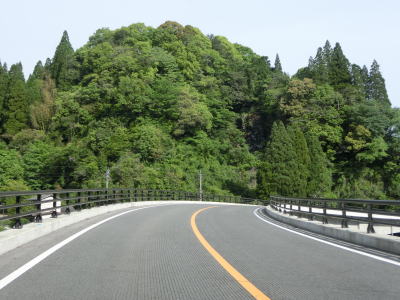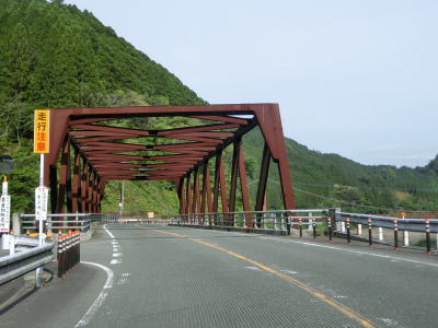 | 日向神ダム湖の湖畔を走っていると複数の橋を渡りながら2車線道路を走る。それらの橋はダム湖ではなくダム湖に流れ込む川や谷に架かっている。ダム湖には市道(?)の鶴橋が架かっている。14tの重量制限があるが道幅は1.0車線分しかなく、どちら側からも直角に曲がらなければならないため中型トラックでも進入は難しいかもしれない。さくら橋を渡ると雨量通行規制区間に入るが、竹原峠トンネルの東の区間と同じ連続雨量200m超で通行止になる。 | ||