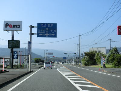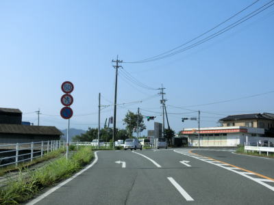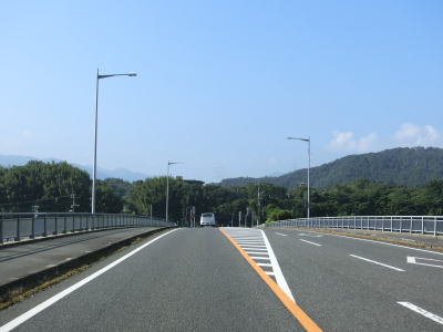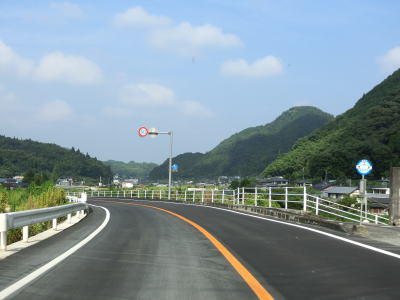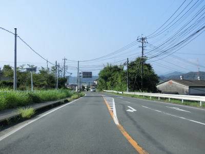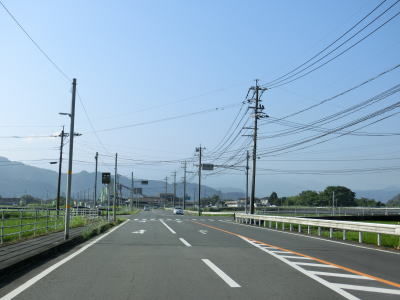 | 糸田交差点から程なくして新糸田橋を渡って緑川の右岸の平坦地を走る。緩やかな短い勾配を上って堤防上を走っていると熊本r240有安交差点を通過する。御船町と甲佐町のそれぞれの中心部を結ぶルートながら交通量はさほど多くない。 | ||