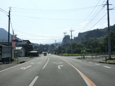 | 氷川ダムの左岸に至る市道と接続している旧道らしき道路との交差点を通過するが、現在の国道沿線にも家屋が建っている。小さな集落を繋ぎながら氷川の右岸を走り大道橋で左岸に移る。以降も道路状況に変化はなくごく緩やかな下り勾配の2車線道路が続く。カーブは多いが極端に急なものはなく概ね走りやすい。 | ||