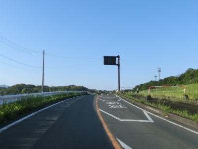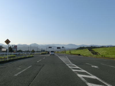 | 熊本r50交差点からは御船川の右岸の堤防の外側を走る。熊本r32上島交差点を通過するが、r32はなぜか御船川を渡った先の嘉島町・御船町境までの500m程度しか指定されておらず、その先は熊本r106となっている。地図を見て少し南に視点を移動すると熊本r240との交差点以南にr32の続きが確認できる。緑川を挟む区間が分断されているが、地理的に道路が造れない場所には見えない。 上島交差点から御船川沿いの平坦かつ直線的な快走路を走っていると御船町に入り、直後に九州道の高架をくぐり御船ICを通過する。インターチェンジ以降は車線が減少するパターンが想像されたが、片側2車線道路が続いている。 |