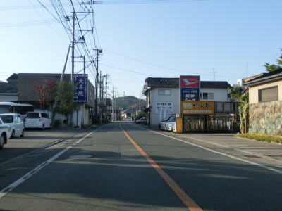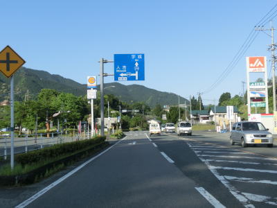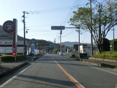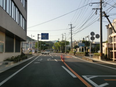 | 旧道に進んでから約1.4kmで信号機のない交差点を通過するが、案内標識にはおにぎりが消されていた。支柱に付けられたR445のおにぎりのみ残されており、消されたのはR443のおにぎりと思われる。御船町の中心部の東に造られたR443バイパスの開通以前は僅かながらR443との重複区間があったのだろう。R443の旧道との重複区間は市街地を走っているため沿線の建物が多い。 旧道に進んでから約2.5kmでR443との辺田見交差点を通過する。旧道に進まずに直進してバイパスを走った場合は辺田見交差点から約400m北西の交差点を右折してR443との重複を経て辺田見交差点に至るルートとなる。 |