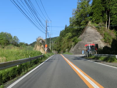| 山都町に入ってから程なくして橋桁が乗っていない橋脚の間を通過する。これはR445のバイパスではなく九州中央道の橋脚である。九州道との嘉島JCT〜小池高山ICの一区間は2014年3月22日に供用が開始されており、小池高山IC〜(仮)矢部IC間は工事中である。R445との交差部分に(仮)北中島ICが設置される予定である。 山都町内においても緩やかな勾配とカーブの多い2車線道路が続いている。大星集落付近には登坂車線が設けられているが、矢部サンバレーカントリークラブ付近で越える峠には特に名称は付けられていない模様。名もなき峠以東も2車線道路が続いている。 |