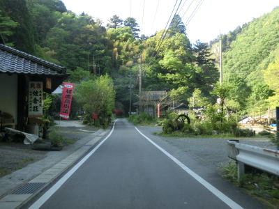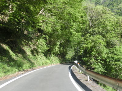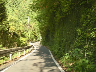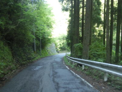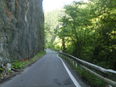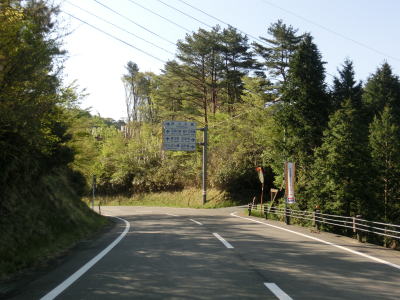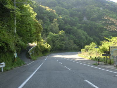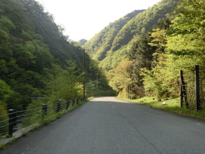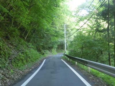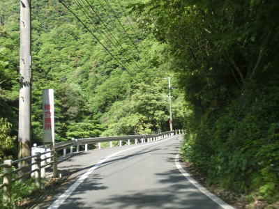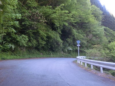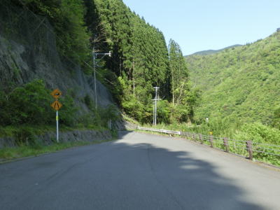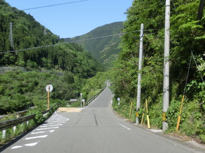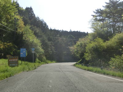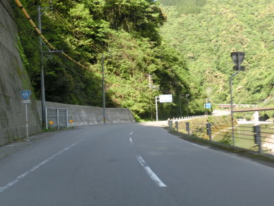 | センターラインがなくなり上り勾配10%と幅員減少の標識を過ぎると道幅が狭くなる。が、勾配はほとんど変わらず標識にあるような10%勾配とは思えないし、上りではなくむしろ下り勾配である。1.0〜1.5車線の谷筋の狭路を走るが、これまでに似たような道路状況の区間を走っているため特に目新しさは感じない。 | ||