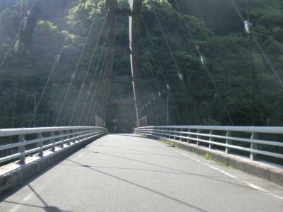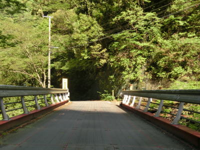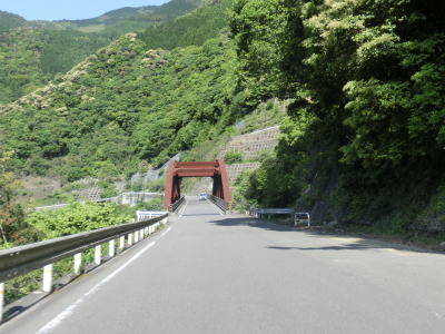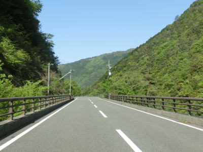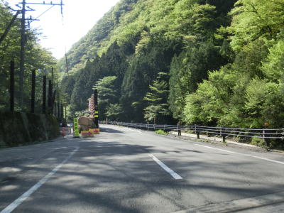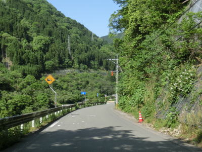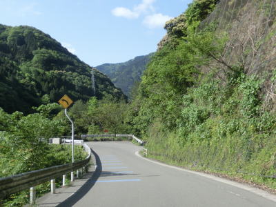 | 八代市内の狭路区間も道幅が狭く1.0車線程度で離合できない箇所もある。乗用車同士であればなんとか離合できる1.5車線幅の区間も少なくない。狭路区間内に梅の木轟公園吊橋があり、紅葉の名所らしいのでその時期は交通量が増大する事が考えられる。通行時はゴールデンウイークとは言え平日だったため、さほど交通量は多くなかったが、それでも5,6台の車とすれ違っている。 | ||