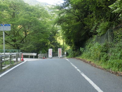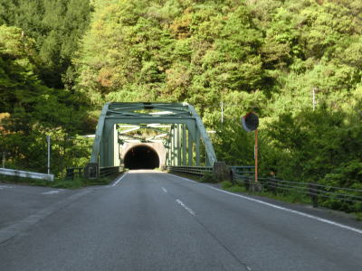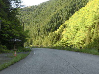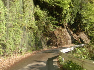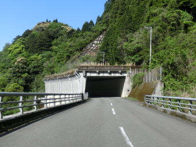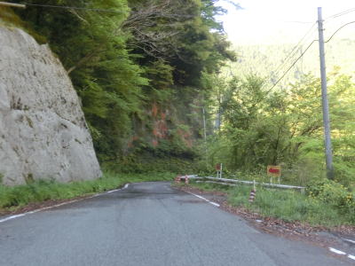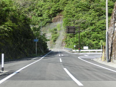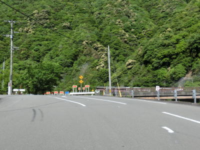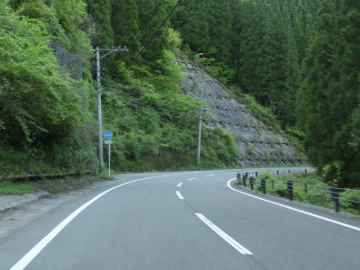 | 谷内川に沿って緩やかな勾配の2車線道路を走る。谷内川を何ヶ所か渡っているが、その中には対岸に旧道らしき道路が見える場所もある。1.0車線幅の旧道は出入口にガードレールが置かれており進入できない。2車線快走路と淡々と走っていると法面崩落現場を3ヶ所通過する。そのうちの2ヶ所は南向き車線が完全に塞がれているが、片側交互通行規制は敷かれておらず、減速して対向車の有無を確認して通行しなければならない。 | ||