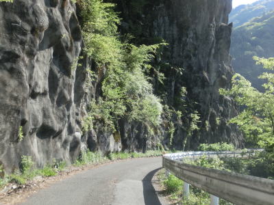 | 谷内川の谷筋を走っているが比較的広い谷筋のため日が差し込んでいる箇所も多い。しかし日光が当たっている場所にも関わらず山肌から流れ出した水が路面を流れている箇所もある。大小屋谷が川辺川に合流している付近からは大小屋谷に沿って北東の方角に進む。ロックシェッドが2ヶ所造られているが、内部は整備された2車線ではなく1.5車線と道幅に関しては改良されていない。 | ||