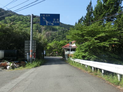 | 熊本r159交差点からはセンターラインこそないものの道幅は2.0車線と広くなる。交差点=峠付近には元商店を思われる建物や物産店(食事処?)があり、広い駐車場を備えている。それらの前を通り過ぎると異常気象時通行止区間の始点を示す標識が立っている。とは言っても美里町の境石集落から既に異常気象時通行止区間に入っており、峠から南側のみが規制対象区間という訳ではない。通行止になる基準が連続雨量200mmというのは境石集落とおなじだが、それに加えて時間雨量30mmが設定されている。 異常気象時通行止区間に入ると意外にも緩やかな勾配とカーブの2車線道路となっている。狭路酷道だった美里町側と同様に交通量は非常に少ない。二本杉峠から約900m走ると五家自然塾や左座家、せんだん轟(の滝)に至る市道だか林道だかとの交差点を通過する。その直後には谷内、黒原集落への市道との交差点を通過する。 |