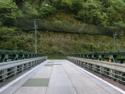 | ロックシェッドをくぐってからも狭路が続いており、通行止の看板が置かれた旧道との交差点を左折してまたしても仮設橋のような橋を渡る。通行止の旧道はゲート等でガチガチに固められている訳ではないが、車両での進入はできない。 | ||