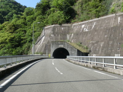 | R445は2車線快走路と緩やかに下っていく。川辺川の対岸の国道ほぼ同じ高さに道路がある事を確認できるが、これは樽水、朴の木集落をR445(正確に言えば平家トンネルの旧道)とを結ぶ市道もしくは林道である。旧道との交差点の直後に川辺川支川を渡り平家トンネルをくぐる。トンネルの名称は平家という地名があるではなく五家荘に平家落人の伝承がある事に由来している。 | ||
