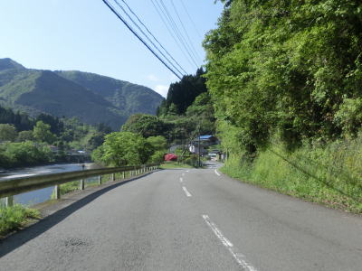 | 宮園橋からはセンターラインがなくなるが道幅は2.0車線以上は確保されており走り、すぐにセンターラインが現れて2車線になる。相変わらず川辺川に沿っており、アップダウン・勾配ともに緩やかな快走路が続いている。集落内においても2車線のままで通り抜ける事ができる。梶原川を渡った直後に熊本r161との交差点を通過する。このr161は分断区間があるが、分断されている白石越は県境ではなく水上村との村境である。 | ||