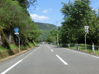 | 川辺川と飛行場用水路の間の平地を快走する。川沿いという状態には変わらないが、山岳部という雰囲気ではなく狭いながらも平地を走っている感じである。川郵便局付近で右にカーブして川辺大橋を渡って川辺川の右岸に移り左急カーブを曲がる。その後も2車線快走路が続いている。広域農道との交差点を過ぎた先の右カーブの手前20t超始点標識が唐突に現れる。 | ||