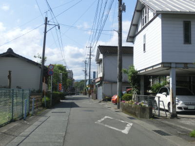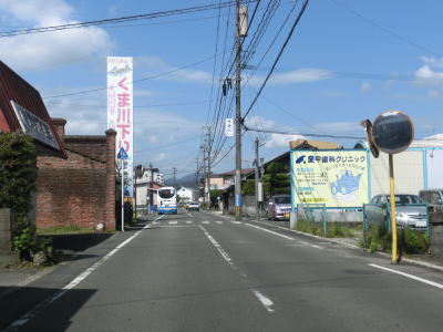 | 山江村は南端部を掠める程度なので700m程進むと終点のある人吉市に入る。人吉市に入ってからは下り勾配となり、やや急なS字カーブを曲がった先で九州道の下を通過する。以降も下り勾配が続いているが、沿線の家屋は増えており市街地に差し掛かった事が実感できる。平坦になってから市道との交差点を通過するが、右折すれば人吉ICに行く事ができる。なお、人吉ICという名称ではあるが料金所から本線までの部分は山江村域に属している。 | ||