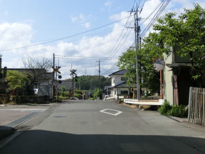 | 市道との十字路からも1.5車線狭路が続いている。道路の左側には暗渠化された水路があるのだが、暗渠化されていなければ離合できない1.0車線幅と強烈な狭さであった事だろう。願成寺の西を通過した所でくま川鉄道の踏切を渡り、緩やかな勾配を下る。勾配を下り切り球磨川の手前で熊本r33との交差点に突き当たる。案内標識のない交差点だがR445は右折である。r33の交通量が結構多く信号機がないうえにJR肥薩線の踏切が近接しているため、中々右折できない厄介な交差点である。 | ||