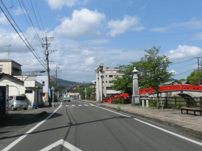 | 五日町交差点から西は2車線と車線の数こそ変わらないが歩道が設置されているため多少走りやすくなったと感じるかもしれない。信号機のない熊本r17交差点を通過した直後に市道との九日町交差点を通過し、さらに西進すると人吉駅に至る熊本r188との交差点を通過する。r188交差点からはセンターラインがなくなり1.8車線幅と少し狭くなる。青井阿蘇神社の鳥居と禊橋の前を通過する。この青井阿蘇神社の本殿を含む建物は国宝に指定されている。 | ||