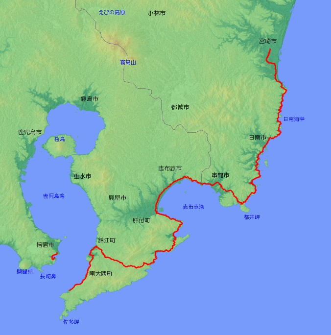 | 主な経由地 | 鹿児島県指宿市…南大隅町〜錦江町〜肝付町〜大崎町〜 〜宮崎県串間市〜日南市〜宮崎市 |