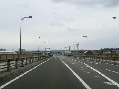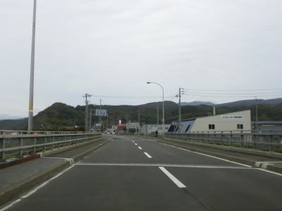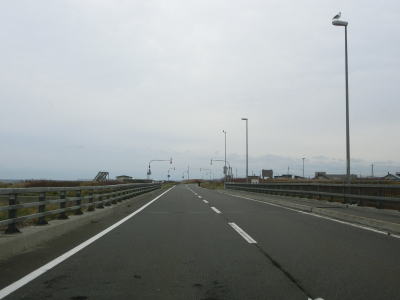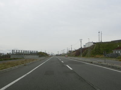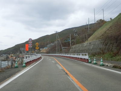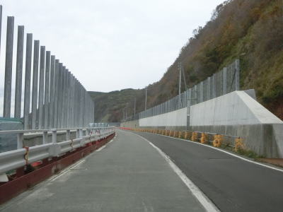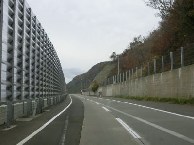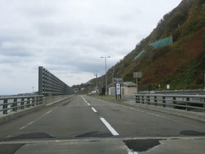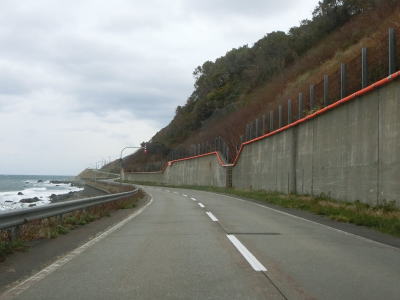 | 電光掲示板を通り過ぎると海を目の前にして右にカーブし、以降は海岸線沿いを走るようになる。海に近く標高も低い事から防潮壁が設置されているが、さらに延伸するための工事が行われていた。車道を山側にずらして2車線を確保していたため通行規制は実施されていなかったが、工事中は片側交互通行規制となる可能性がある。 | ||