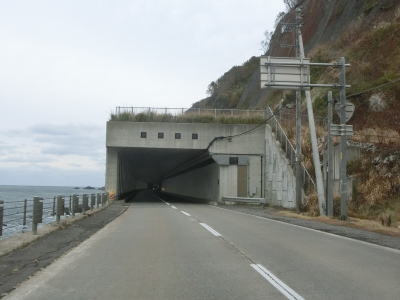 | 岩老集落を出てからも海沿い区間が続いているが、崖に近い場所を通っているため複数のトンネルが掘られている。汐岬トンネル、日和トンネル、湯泊トンネルと、最大でも220mという比較的短いトンネルをくぐる。続いて黒岩トンネル、日方泊トンネルをくぐるが、前者は798m、後者は2087mと結構長い全長である。さらには黒岩トンネルとの間の大部分がスノーシェッドとなっており実際には3000m級のトンネルと言えなくない。 | ||