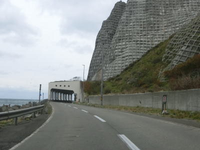 | 川下交差点からはR231との重複区間となって留萌市に向かう。R451のおにぎりや案内標識はなく、重複している事は国道マニアでもない限り分からないだろう。川下集落を出て海沿いを走っていると浜益覆道を通る。 | ||