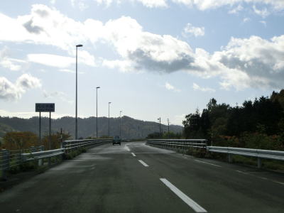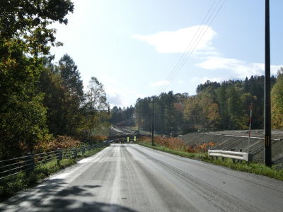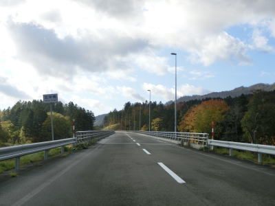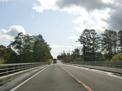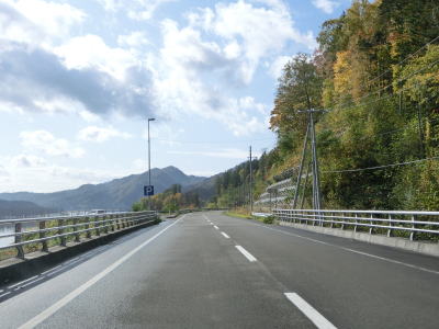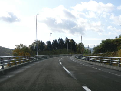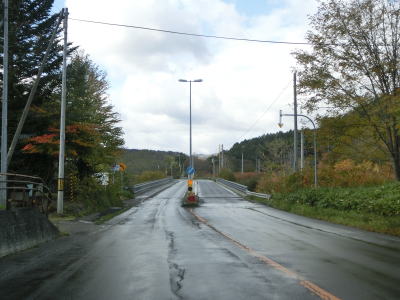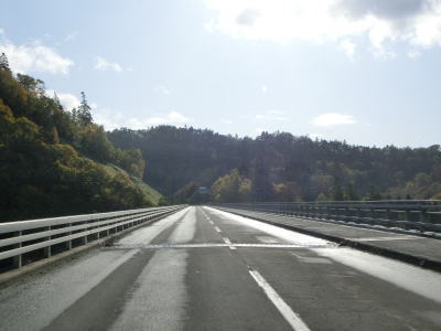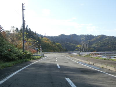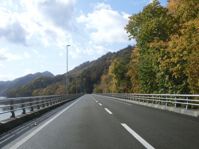 | 桂沢湖の湖畔を走っていると湖畔橋を渡るが、その上を付け替え道路が横切っている。湖畔橋以南は湖の反対側に付け替え道路が並走状態となっている。多くの工事車両が通っているせいか砂で路面が茶色くなっている。 | ||