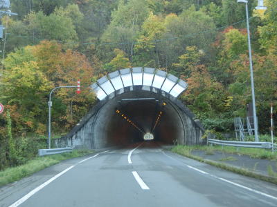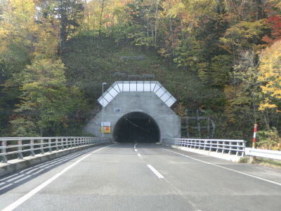 | 急なものを含むカーブの多い2車線道路を走り、右カーブの先で三夕トンネルをくぐって夕張市に入る。三芦トンネルと同様に市名の最初の文字から取ったトンネル名である。三夕トンネルを出ると比較的開けた谷筋を下って行く。三笠市側に比べてカーブが少ないため走りやすさが向上する。 | ||