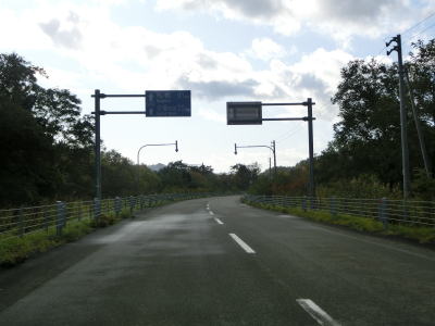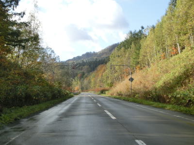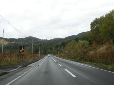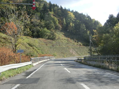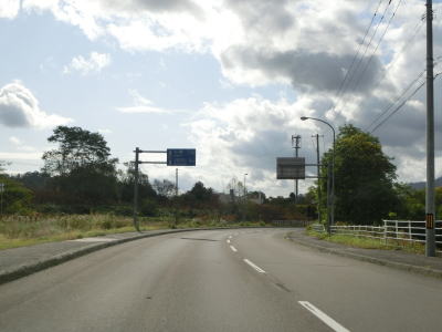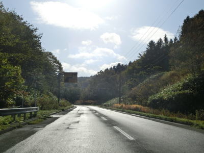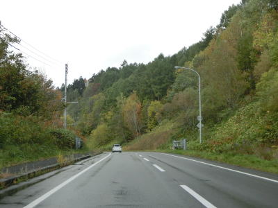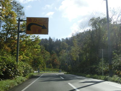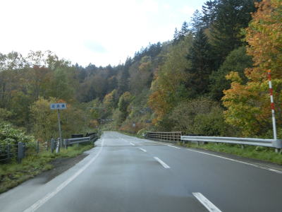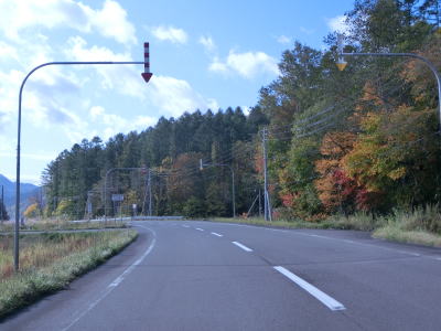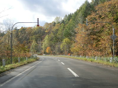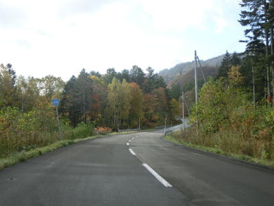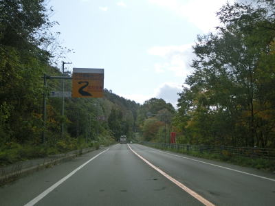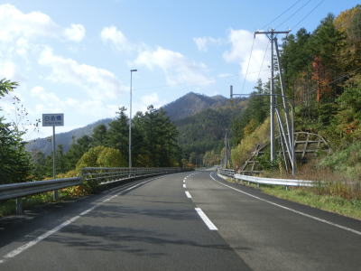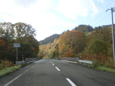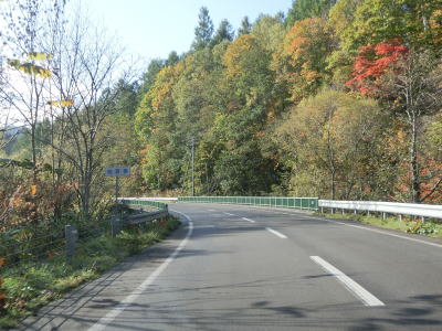 | 蛇行する幾春別川に忠実に沿っている訳ではないが小刻みなカーブが多い。とは言うもののセンターライン付きの2車線道路なので特段走りにくい道路状況ではない。夕張紅葉山と夕張までの距離が記された案内標識が立っており、それぞれ45kmと36kmとなっているため、夕張市街を通り過ぎた後に夕張紅葉山に至るのかと思ってしまいそうになるが、最終的にはそれぞれ別の方向に進む事になる。 | ||