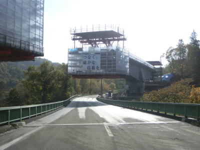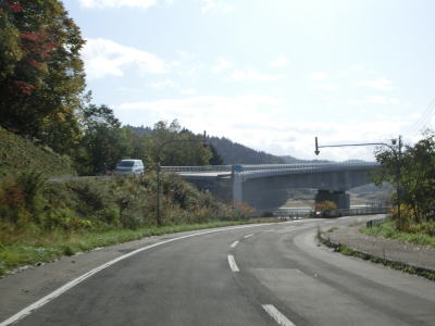 | 桂沢湖の湖畔を回る旧道(林道?)との交差点を通過して熊追橋を渡って右カーブを曲がる。カーブの途中で左側に建設中の道路と橋梁が確認できる。これは新桂沢ダムの建設(既にある桂沢ダムの嵩上げ)に伴う付け替え道路である。桂沢大橋の東に架けられている橋は8号橋という仮称が与えられている。 | ||