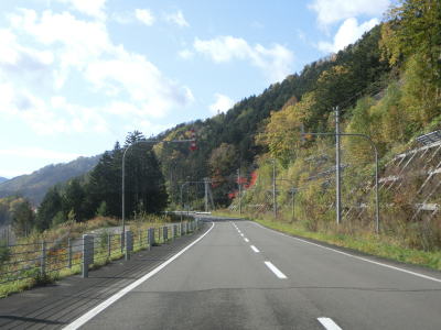 | 長い下り勾配が続いているが、緩やかなカーブばかりで一部は直線の区間も存在しているなど道路状況は良い。大きく右にカーブしてからは夕張川の右岸を走るようになるが、川面が見えないので川沿いという印象は薄い。 | ||