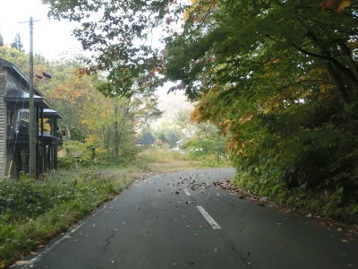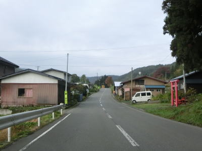| 標高500m付近からは等高線沿いではなくなるが勾配は緩やかなままである。急なカーブが多く路面に落ち葉が多いためバイクだと気を遣った走りにならざるを得ないかもしれない。廃校になった東湖中学校の出入口で左カーブを曲がって集落に近付く。 | ||