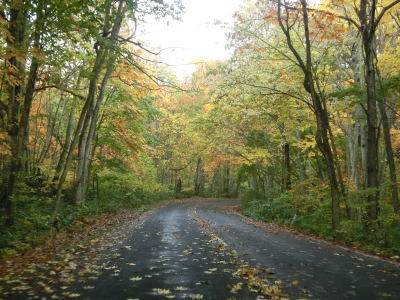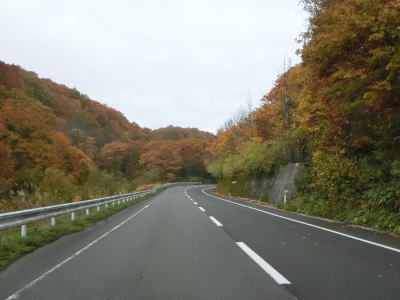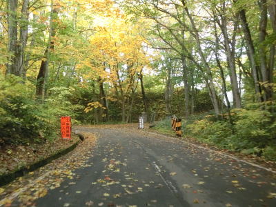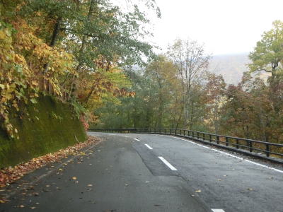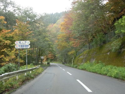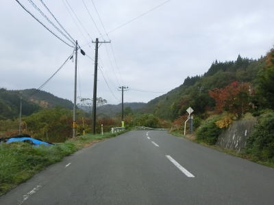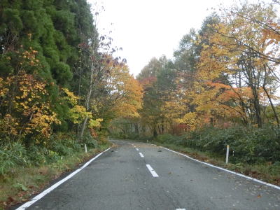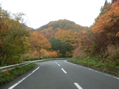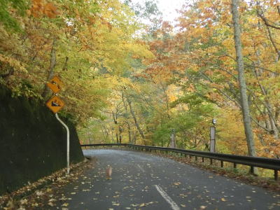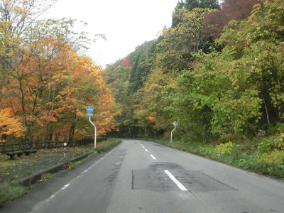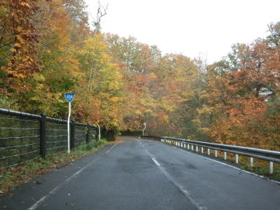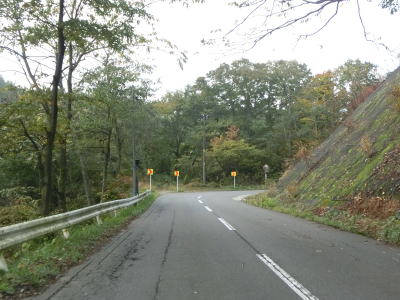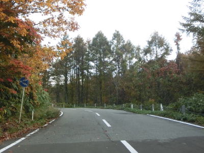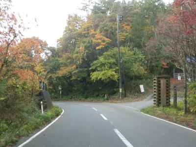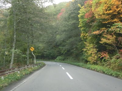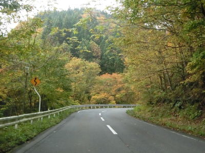 | 急カーブが少なくなってもカーブの多い状態は続いている。平日なので交通量は少ないが、休日、特に紅葉期は交通量の増大が見込まれる区間である。今回走行したのは10月下旬とあって標高を上げるにしたがって色付いた木々が目立つようになってくる。 | ||