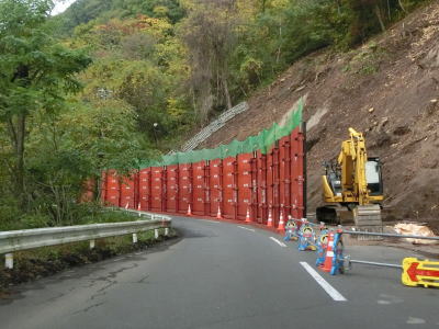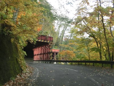 | 路盤の崩壊の復旧工事(?)のため片側交互通行規制が敷かれていた。工事箇所を過ぎてすぐに左カーブを曲がって8%の急勾配を下って右のヘアピンカーブを曲がる。さらに少し走るとスノーシェッドをくぐるが、シェッド内は急カーブである。 | ||