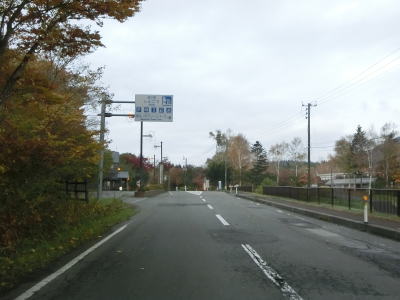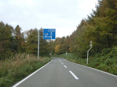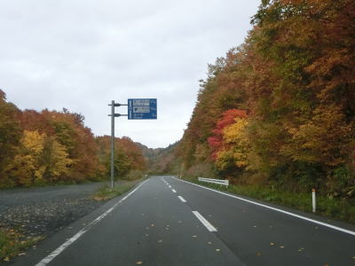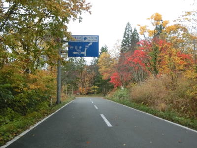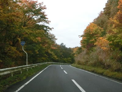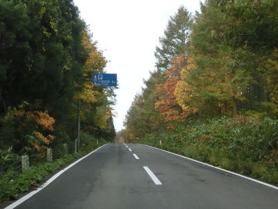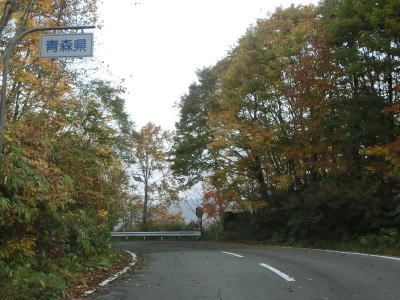 | ほとんど勾配のない状態の2車線道路を走っていると左の急カーブ部分で見返峠を越えて青森県十和田市に入る。秋田県域を通っている距離は約3.9kmと短いが、管理は秋田県の鹿角地域振興局によって行われているようである。 十和田市に入ってからは峠を越えているため下りとなるが、等高線に沿っているため勾配は緩やかである。急カーブも存在しているが、走りにくさを感じる程ではない。紅葉の最盛期だったが平日のため交通量は多くない。 |