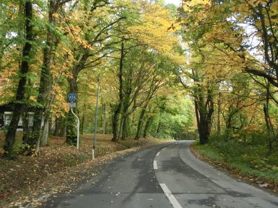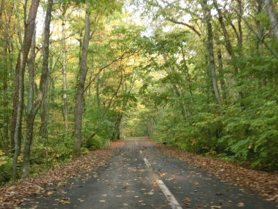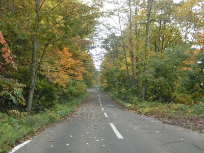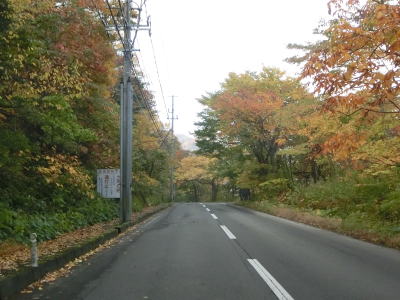 | 道路通行規制区間に入ってからも平坦でカーブの少ない走りやすい道路が続いている。写真では樹木が生い茂っている中を走っているように見えるが、十和田湖のすぐ傍であり所々で湖面が見える。 | ||