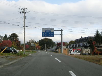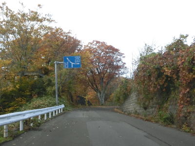 | 宇樽部交差点からすぐに樹木が生い茂っている中に突っ込むが、その落差が旧道らしい風景となっていた。センターライン付きの2車線道路であり酷道と呼べる程ではないと言いたいところだが、紅葉期とあって落ち葉が路肩付近を中心に堆積しており有効な車線幅が狭くなっていた。まだ国道の指定を受けているとは言え、整備の手がしっかり入っているとは言えないようで判別の難しい標識も見られる。 | ||