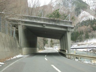 | 二升石集落を通り過ぎた後に二升石1号ロックシェッドと二升石2号ロックシェッドを相次いでくぐる。どちらも短いロックシェッドで内部のセンターライン付きの2車線道路で走りやすい。 | ||