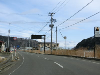 | 岩手r44交差点を通過した直後に三田市橋を渡って小本川の右岸に移るが、すぐに袰野大橋で左岸に戻る。袰野集落と赤鹿集落の間で法面工事に伴って片側交互通行規制が敷かれていた。川沿いの快走路を走っていると日向集落を通り抜けるが、護岸の改修(復旧?)工事が行われたようである。 | ||