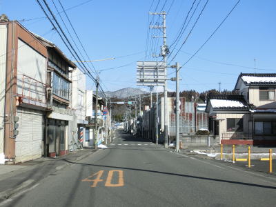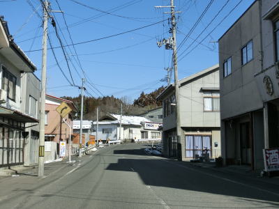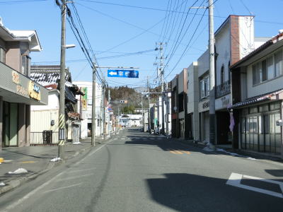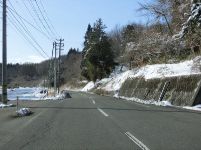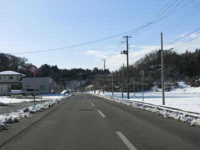 | 馬籠町集落を通り過ぎると沿線の家屋は疎らになるが、集落が途切れる訳ではない。制限速度50km/hの標識の下には「見通し悪し」という補助標識が付けられているものがいくつか見られる。勾配もカーブも緩やかな2車線道路を淡々と走っていると過去の津波浸水区間に入る。ここでいう“過去の津波”とは2011年3月11日の東日本大震災の津波を指す事は言うまでもない。 | ||