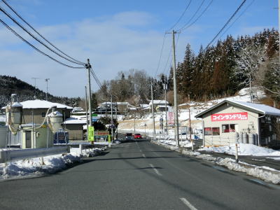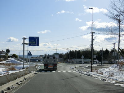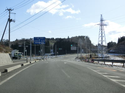 | 岩崎橋を渡って少し走ると本吉バイパスと南三陸グリーンロードという広域農道との交差点に至る。案内標識におにぎりが表記されていないが、左折の本吉町内方面は現道であり、2024年2月の時点でもウォっちずでは現役扱いされている。R346走行時はバイパスを走行したが、今回は左折して現道を走る。 | ||