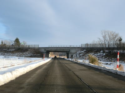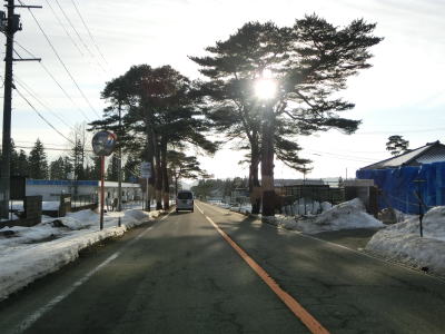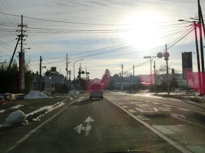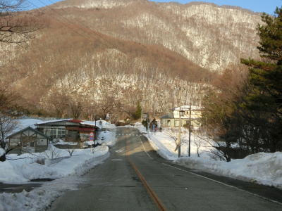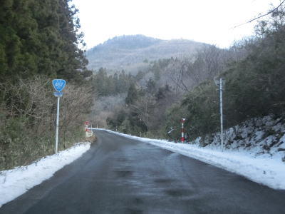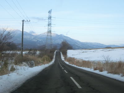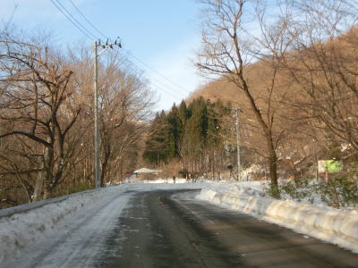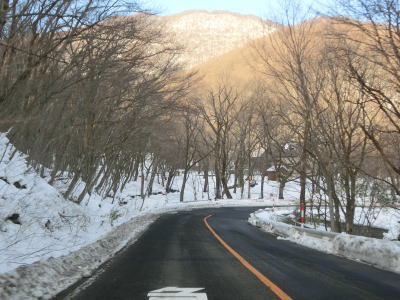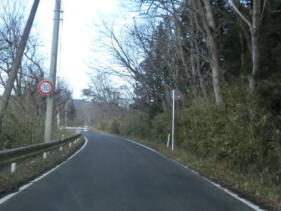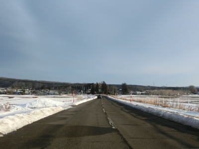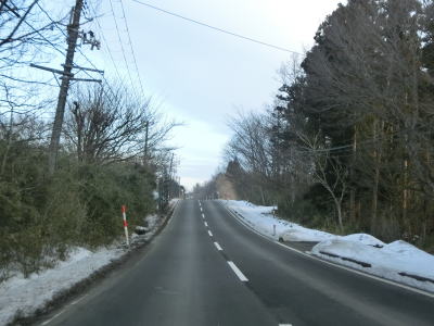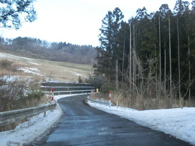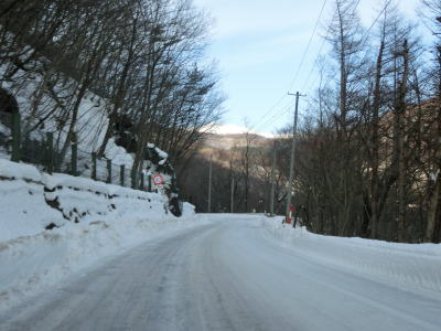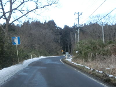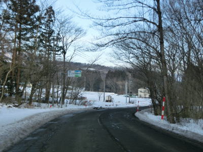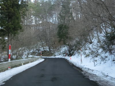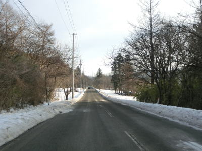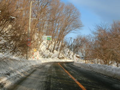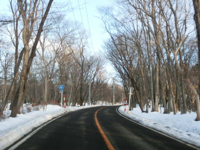 | 1.5〜2.0車線幅の狭路をひたすら走る。白石牧場方面への市道(林道?)との交差点付近から急カーブが多くなる。路面の積雪はほとんどなく路肩に残っている程度だが、若干道幅が狭く感じられる。積雪がなければもう少し走りやすく感じるのかもしれない。 | ||
