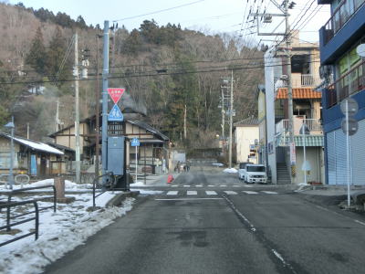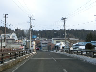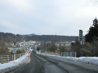 | 左カーブを曲がると勾配がきつくなり遠刈田温泉を視界に入れながら下る。勾配が落ち着くと遠刈田大橋を渡って温泉街に入る。市道との十字形状の交差点では一旦停止しなければならないが、町道が優先という訳ではなく4方向全ての進入に際して一旦停止が必要である。 | ||