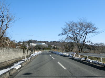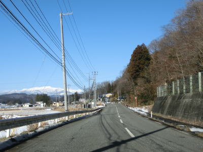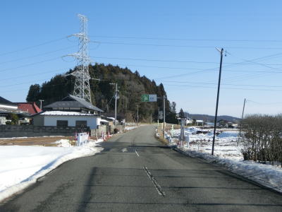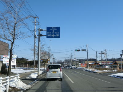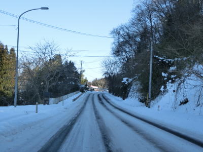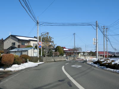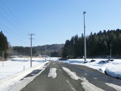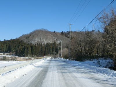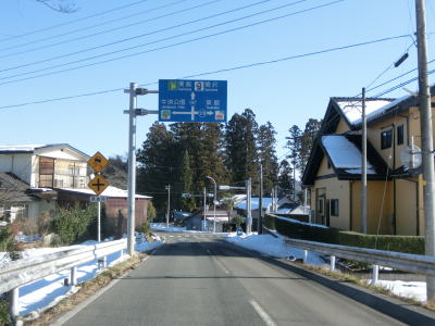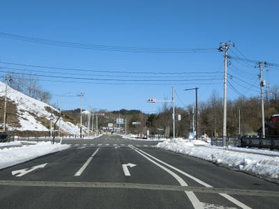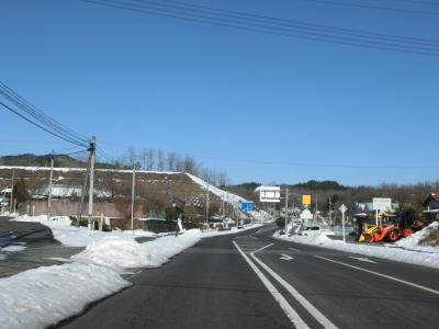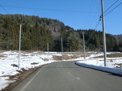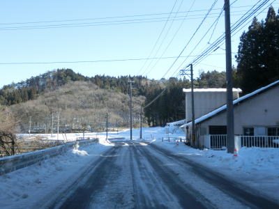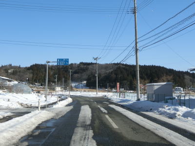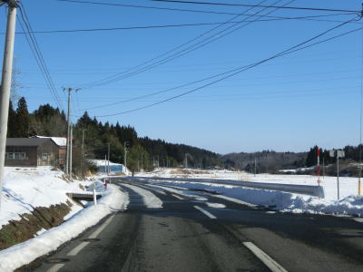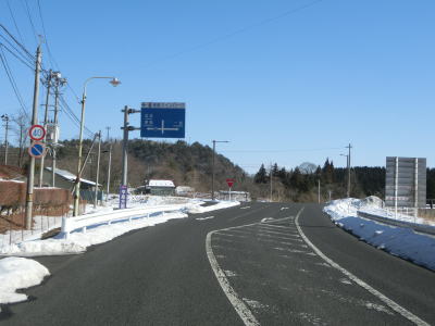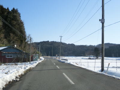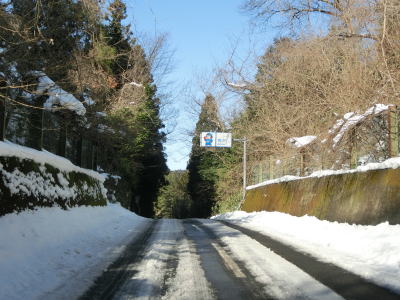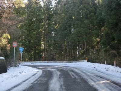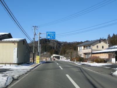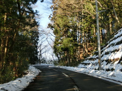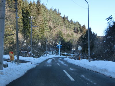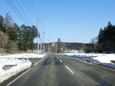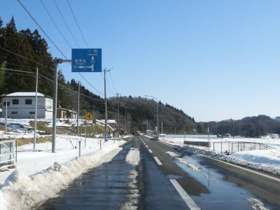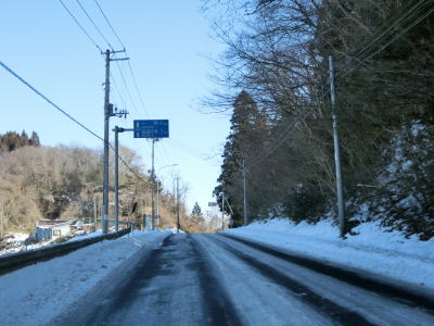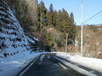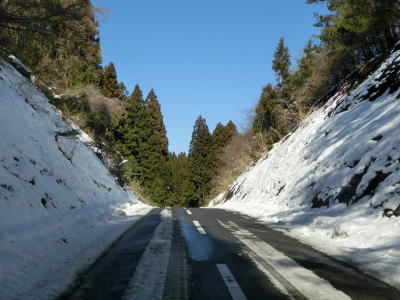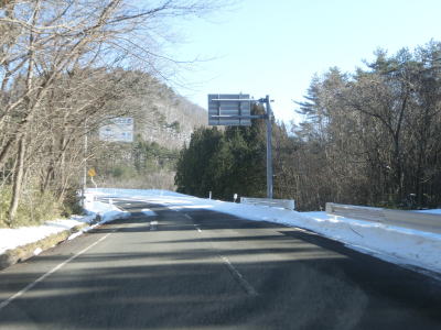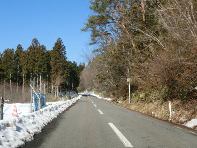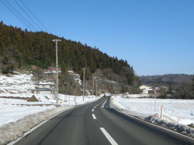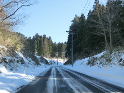 | カーブの少ない2車線道路で山間部を走っていると徐々に路面の積雪が多くなり、日の当たらない場所は轍部分にも積もっていた。名もなき峠を越えて旧鶯沢町に入ると下り勾配になる。カーブは増えるが急なものはなく概ね走りやすい。 | ||