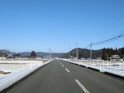 | 山裾からも離れると水田の間の平坦な道路を北上する。カーブはあるものの大半が緩やかで、道路状況が良い割に交通量は極めて少ないため非常に走りやすい。三迫川沿いとなっても状況に変化はない。 | ||