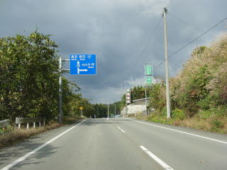 | 本合海集落を抜けだす所でR47本合海交差点に突き当たり、右折してR47との重複区間に入る。二桁国道と重複しているが新庄市の外れとあってローカル快走国道となっておりハイペースで走る事ができ、信号、交通量ともに少ない緩やかなアップダウンとカーブの2車線道路を淡々と走る。本合海交差点から1.8km進むと長坂交差点となり左折する事でR47から分岐する。 | ||