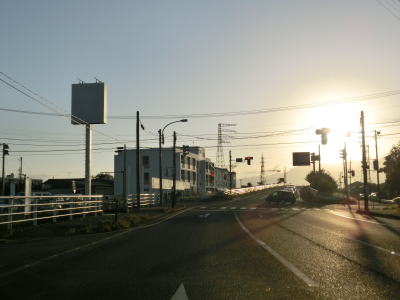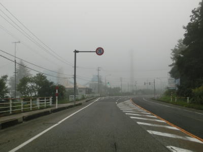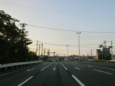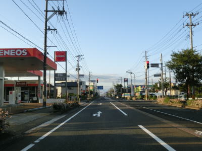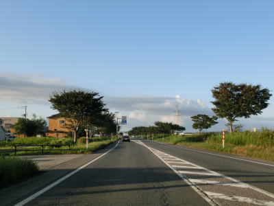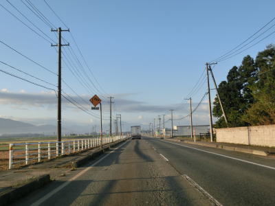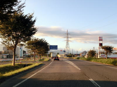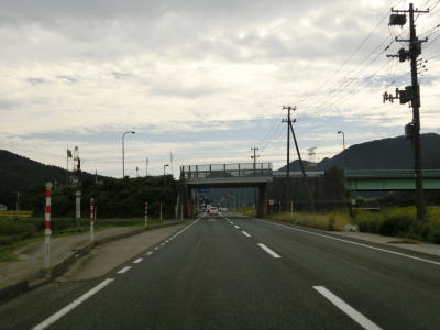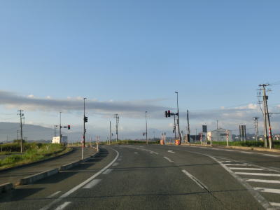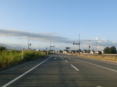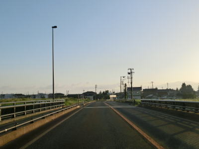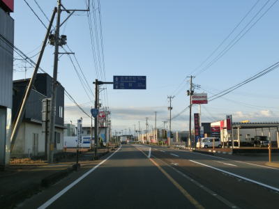 | さらに南下を続けると商業施設も少なくなり水田が目立つようになる。遮る物が何もないせいか、横風注意の警戒標識が立てられている。しかし雪国によく見られる防雪柵は設置されていないので降雪は大したことないのかもしれない。横風注意区間を走っていると左にカーブしながら市道との鴨深交差点を通過する。ここで交差している市道は現在の国道(=阿賀野バイパス)の旧道に当たる。 | ||