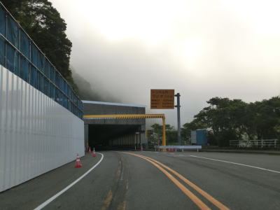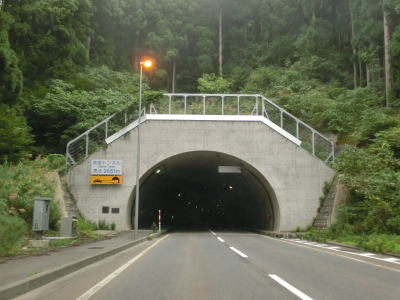 | 黒岩トンネルを出た直後に小花地大橋で阿賀野川の左岸に移る。橋の下には通行止になったR459(実質R49)の旧道がある。非常に緩やかな上り勾配の2車線道路を走っていると赤岩トンネルに入る。このトンネルの全長は2661mと長く、阿賀野川右岸の難所を気軽に通行できるようになった。トンネルを出てからは緩やかな勾配を下りながら2車線道路を快走する。 | ||