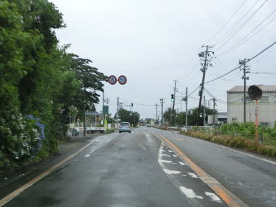| 歩道がいまいち整備されていない2車線道路を淡々と走っていると新潟r586下里交差点を通過する。左の急カーブを曲がった後にJR羽越本線の跨道橋をくぐり、右カーブを曲がる。左カーブの手前には旧型のその他の危険標識が残っている。 | ||
