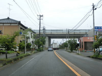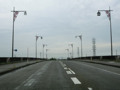 | 真木野大橋を渡り終えるとS字状のカーブを曲がるが、そこから中央分離帯が現れる。車線が増えて片側2車線道路になって新津大橋を渡ると新潟r5交差点を通過する。r5交差点を過ぎると夕映えの跨線橋となり、JR羽越本線と信越本線を一気にオーバーパスする。2つの線路を越えているため、橋長は673mと跨線橋としては長い方である。 | ||