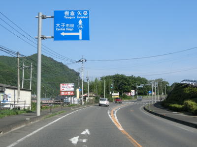 | 景色が開けるようになるのに前後して勾配がほぼなくなって平坦になる。野上川の右岸流域を走っていると幅員減少の警戒標識が立っているが、路肩がなくなって車線幅が狭くなるものの2車線道路は維持されている。S字状にカーブして弾正橋を渡った後は車線幅が広くなる。 | ||
