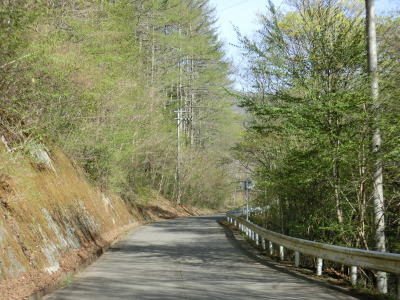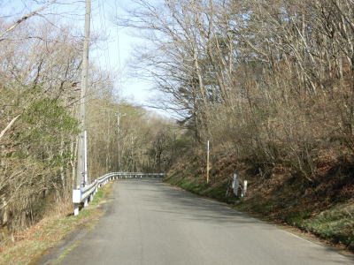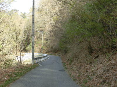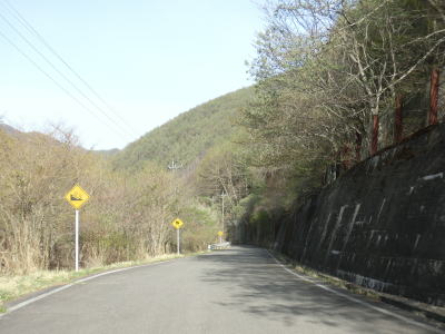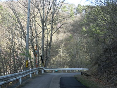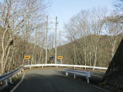 | 抜井川沿いになるとカーブは緩やかになる一方で勾配は10%と急になる。が、道幅が広くなるため走りやすくなったと感じるかもしれない。10%勾配区間の終わりで十山林道と大野沢林道との交差点を通過する。南に延びているのが十山林道、北に延びているのが大野沢林道である。林道との交差点からは勾配が緩やかになり、第19号カーブを曲がって茨口橋を渡る。 | ||