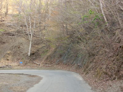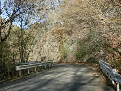 | 左のヘアピンカーブを曲がった先で川に降りる階段が確認できるが、乙女の滝に向かう徒歩道である。R299走行時はロープが張られており進入禁止だったが、それもなくなっていたので滝まで行けると思われる。ただし、入口付近に駐車場はなく200m先の石堂駐車場を利用するしかない。その石堂駐車場からも徒歩道が伸びている。 石堂駐車場を過ぎるとセンターライン付きの2車線道路になるが、鎰掛橋にかけてはヘアピンカーブが連続している。四方原山への登山道の入口を通過するが、その近くにキャンプ場の跡地のようなものがある。 |