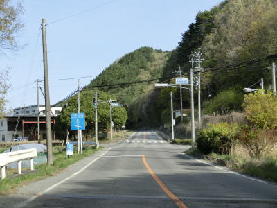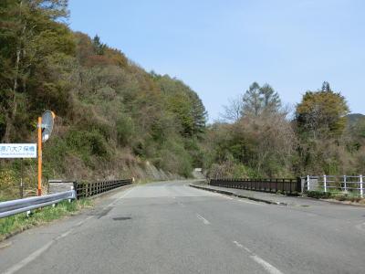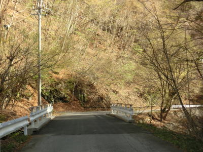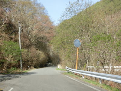 | 古谷ダムの脇を通り過ぎた直後に古谷大橋を渡り、その後は緩やかな勾配を下って行く。川面との高低差が小さくなる辺りで馬返し集落に入るが、その手前から道幅が狭くなってしまう。 | ||